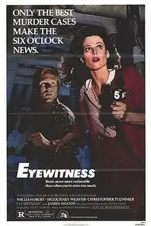 Eyewitness (released in the UK as The Janitor) is a 1981 American neo-noir[4] thriller film produced and directed by Peter Yates and written by Steve Tesich. It stars William Hurt, Sigourney Weaver, Christopher Plummer, and James Woods. The story involves a television news reporter and a janitor who team to solve a murder.[5]