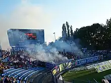 Ultra supporters of Baník call themselves Chachaři, which means "bad boys" in the local dialect.[14] Some of the ultras' songs contain lyrics proudly demonstrating willingness to not only sing, but also fight for their club. Baník's ultras have made friendships over the years, and in 2006 celebrated 10 years of partnership with 2nd division Poland club, GKS Katowice. The celebration took the form of a game between the two teams, organised by the clubs' directors. The fixture took place at GKS's stadium, where throughout the 90 minutes the opposing sets of fans sung one another's songs. At the end of the game, both sets of fans climbed over metal fences in order to race onto the pitch come the final whistle to embrace and exchange scarves.[15]