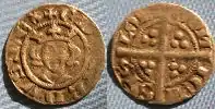 The patent rolls from the reign of Henry III indicate that dies for producing silver halfpenny and farthing coins were issued to London moneyers on two occasions in 1222.[4] The coins bear the short-cross design,[5] which had been used on pennies since the reign of Henry II.[6] The obverse shows a king holding a sceptre, with the legend HENRIREX ("King Henry"), while the reverse shows a small cross with three pellets in each quarter and the legend [NAME] ON LUND ("[Moneyer's Name] of London").[5] J. J. North speculates that the issue had a short duration;[4] as of 2001, only five examples of Henry III silver farthing coins were known to exist.[7]