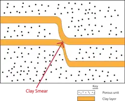 Clay minerals are phyllo-silicate, in other words, with sheet-like structure.[14] They are effective agents that block fluid flows across a fault zone.[14] Clay smears, deformed layers of clay, that are developed along fault zone can act as a seal of hydrocarbon reservoir i.e. extremely low permeability that nearly prohibits all fluid flows (Figure 7).[1]