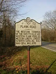 The Fayetteville and Western Plank Road was a 129 mi (208 km) plank road from Fayetteville, NC to the Moravian settlement at Bethania, NC.[1] The road was constructed from 1851-1852 using funds raised by boosters and accompanying funds provided by the state of North Carolina.