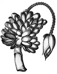 Fe'i bananas are cultivated varieties (cultivars), rather than wild forms. They are distinctly different from the much more common bananas and plantains derived from Musa acuminata and Musa balbisiana.[2] All members of the genus Musa are tall herbaceous plants, typically around 3–10 m (10–33 ft) tall or even more. Although they appear tree-like, the "trunk" is actually a pseudostem, formed from the tightly wrapped bases of the leaves. At maturity each pseudostem produces a single flowering stem that grows up inside it, eventually emerging from the top. As it elongates, female flowers appear which go on to form fruit – the bananas. Finally male flowers are produced. In cultivated bananas, the fruit is usually seedless and the male flowers sterile.[3]