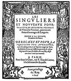Federico de Vinciolo or Federico Vinciolo was a sixteenth-century lace-maker and pattern designer attached to the court of Henry II of France. He was granted a monopoly on manufacturing lace ruffs in France.