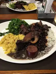![]() Brazilian-style feijoada with a variety of side dishes: rice, fried cassava, pork rinds, oranges, caipirinha, etc. | |