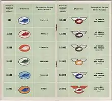 Upon joining one was issued with an official booklet which contained: one's name and Fellowship Number for accounting purposes; information on how the fellowship worked; how to make the salute for greeting "fellow bellows" (upward spiral motion of first finger of right hand depicting an eddy of wind); tear-out slips for handing in with contributions so that it could be recorded by the servants (receipts were given); a chart on the back page for monitoring one's own progress towards promotion. The Fellows were encouraged to continue to contribute because after 1,000 planes had been certified by the Air Ministry and paid for, the Fellow was promoted from PUFF (Soplito) to GUST (Rafaga) and given another distinctive badge. And so the quest for funds through fun went on: with 2,500 planes down and paid for, the GUST became a GALE (Vendaval); 5,000 planes created a HURRICANE (Huracán), 6,500 a TORNADO (Tornado) and 8,000 a TYPHOON (Tifón). With each promotion, a further distinctive badge was issued. 10,000 planes downed and paid for entitled Fellows to obtain the honour: THE ORDER OF THE BELLOWS and were given their wings; wings were added to a special badge depicting a bellows. It was a further masterstroke that the incentive of promotion encouraged continuing monthly payments.