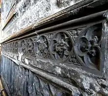 Detail from Bourchier tomb remnant, Bampton Church, showing in a row within quatrefoils Bourchier knots alternating with water bougets of the Bourchier arms