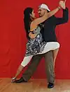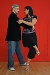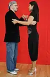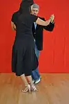 | Abrazo cerrado | V-shape close embrace | Salon and tango nuevo | The dancers' chests are closer to each other than their hips, and often there is contact at about the level of the chest (the contact point differing, depending on the height of the leader and the closeness of the embrace). In close embrace, the leader and the follower's chests are in contact and they are dancing with their heads touching or very near each other. | ![]() | ![]() |