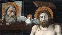 The Holy Spirit coming from both the Father and the Son, detail of the Boulbon Altarpiece, c.1450. Originally from the high altar of the Chapelle Saint-Marcellin, Boulbon, France, now in the Louvre, Paris.