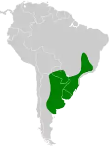 The firewood-gatherer is found in Brazil from Goiás and Minas Gerais south through Rio Grande do Sul, central and eastern Paraguay, essentially all of Uruguay, and northern Argentina from Formosa and Misiones provinces south to Río Negro Province. It inhabits a wide variety of open landscapes including seasonally wet and other grasslands, pastures and agricultural fields, savanna, scrublands, the edges of open woodlands, and stands of trees near farmhouses. In elevation it ranges from near sea level to 1,000 m (3,300 ft).[7][8][9]