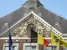 As Belgium is a federal state, the flag of Belgium and the flags of the communities or regions in principle occupy the same rank.[1] Nonetheless, when flags are raised and lowered or carried in a procession, the national flag takes precedence over all the others.[1]