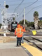 On the railroads, a flagman is an employee of the railroad who is assigned to protect contractors or anyone performing work on a railroad right of way. A flagman is also assigned to protect a train that has stopped on a section of track.[1] When a train approaches a location a flagman is posted, the train crew will have to get permission from the flagman to pass the area.