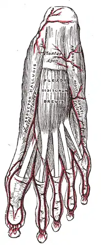 | Artery | Medial and lateral plantar arteries and plantar arch, plantar metatarsal and plantar digital arteries |