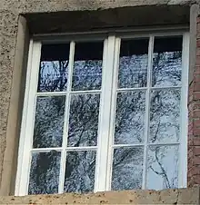 Old window containing a single sheet of float glass in the upper left section, Jena, Germany. The remaining sections are possibly not float glass as indicated by the distorted reflections of a tree.