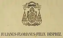 - 1 2 He was baptized "Julien Florian Felix Desprez".[1] That full name appears in the most sources: on the stone that marks his tomb in the Cathedral of Saint Stephen in Toulouse,[2][3] a biography written when he was made a cardinal,[4] an obituary,[5] a biographical sketch published shortly after his death,[6] and a biography.[1] The Bibliothèque nationale de France and the French National Archives use these three forenames in this sequence.[7][8] When he was made a cardinal, the Holy See dropped his third forename and recorded him in Latin as "Julianus Florianus Desprez"[9] and in Italian as "Iuliano Floriano Desprez".[10] Some sources related to the First Vatican Council omit his second and third forenames: "Julien Desprez".[11][12] From his earliest years he used "Florian" as his sole given name.[13] He signed his will "Fl., Card. Desprez".[14] His pastoral letter to the clergy of Toulouse in 1869 prints his full baptismal name on the title page and records his signature on the letter as "FLORIAN, Archev. de Toulouse".[15] Similarly, he signed a letter to Pope Pius IX in Latin "FLORIANUS, Archiepus Tolosanus" and the pope replied to "FLORIANO Archiepiscopo Tolosano".[15][16] On the other hand, modern compilations of biographical information about the Catholic Church hierarchy or the College of Cardinals depart from these 19th-century sources in two ways: they transpose the names Julien and Florian and substitute "Jules" for "Julien".[17][18][19]