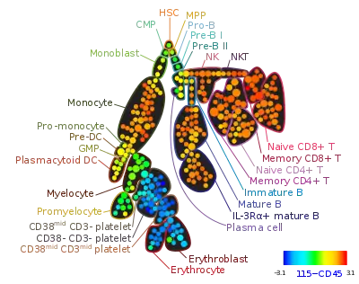 - ↑ Diggins, KE (2015). "Methods for discovery and characterization of cell subsets in high dimensional mass cytometry data". Methods. 82: 55–63. doi:10.1016/j.ymeth.2015.05.008. PMC 4468028. PMID 25979346.