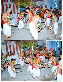 Dandi natana (Devanagari: दांडी नटना) is a stick dance which is also performed in a circular and spiral movement, by tapping the stick on the dancers on the opposite side. The number of performers can multiply from two, to four, to eight, sixteen, and so on.
