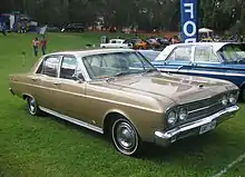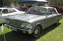 The 1964 US Fairlane 500 sedan was assembled by Ford Australia from December 1963 as the FD model.[12] It was introduced in April 1964, distinguished by a lack of tail fins[10] and a new grille with seven vertical bars.[13] A choice of two powertrains was offered in the new model, a 260-cubic-inch (4.3 L) Windsor V8 with Ford-O-Matic automatic transmission or a 289-cubic-inch (4.74 L) Windsor V8 with Cruise-O-Matic automatic transmission.[10] The 1964 model was the last of the US Fairlanes in Australia, as Ford discontinued the model locally in 1965 to make way for the larger Ford Galaxie;[10] 1,344 examples were produced in Australia.[9]