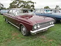 The ZA Fairlane series, introduced in March 1967,[14] was designed and built in Australia, although its front-end styling resembled the American Ford Falcon sedan of that year (except for the quad headlights). The body shape was similar to the 1966–67 US Fairlane sedan, however. Offered as the Fairlane and the Fairlane 500, it was based on the Australian XR Falcon.[14] The 2819 mm wheelbase of the Falcon was stretched to 2946 mm, the front and centre body sections were retained and a new twin-headlight grille was added.[14] The rear quarter panels and boot from the US Fairlane were used, and square taillights (sourced from the 1966 USA Fairlane) replaced the round units used on the Falcon.[14]