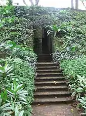 A Christian cemetery used to exist on the hill, serving as the burial ground for early Europeans in Singapore. The first Christian cemetery was used until 1822 and had 3 burials, was located close to Raffles house.[17] The second cemetery was located on the slopes of Fort Canning Hill, and was expanded and consecrated in 1834. A brick wall and a Gothic gateway were constructed in 1846 to enclose it, built by Captain Charles Edward Faber. Two classical monuments, and some headstones placed along brick walls remained at the site.[18] The cemetery continued to be used until 1865 when it was declared full and closed. By this time, around one third of the burials there were of Chinese Christians.[17] In the 1970s the cemetery was exhumed and many of the surviving tombstones were embedded in the surviving walls.
