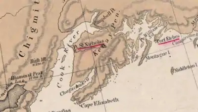 Fort Nikolaevskaia (Russian: Форт Николаевская) or Fort St. Nicholas (Russian: Форт Николас), also called Nikolaevskii Redoubt,[2] was a fur trading post founded by the Lebedev-Lastochkin Company (LLC) in Alaska, the first European settlement on the Alaskan mainland.[3] It is located on the site of modern Kenai. It was one of several posts maintained by the company on Cook Inlet. With the creation of a monopoly in Russian America around the Russian-American Company in 1799, the station continued operations until the Alaska Purchase.[4]