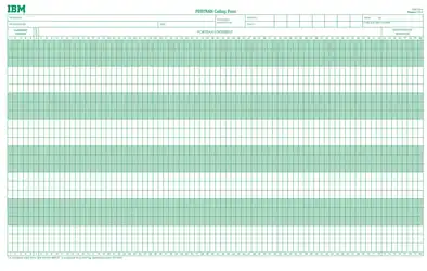 A reproduction of a FORTRAN coding form, printed on paper and intended to be used by programmers to prepare programs for punching onto cards by keypunch operators. Now obsolete.