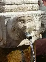 While few fountains were built in French cities, where water was usually taken directly from the river or from wells. many fountains were built in villages, particularly in Provence. These fountains were originally located just outside or at the entrance to a village, at a spring, or close by, connected by an underground gallery. They were often built on the same site as an earlier Roman fountain, and the same basic designs were used from medieval times until the 19th century. Wall fountains were built at the spring, or against the wall of the building. They had a reservoir of water which was filled by gravity, and then the water poured out spouts, or canons, which were often decorated with mascarons, or masks, in the form of the heads of humans, animals or monsters.
