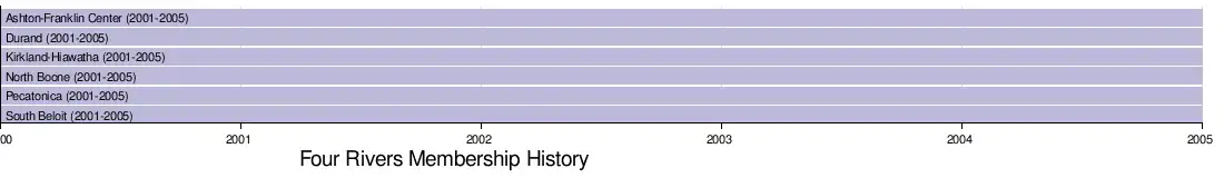 Founded in 2001, the Four Rivers Conference was based primarily on the teams within the East Division of the Upstate Illini Conference. Those teams included: Ashton-Franklin Center, Durand, Kirkland-Hiawatha, North Boone, Pecatonica, Rockford Christian Life, Rockford Lutheran and South Beloit. By 2000, the Upstate Illini had grown to be the second largest conference in the state of Illinois and included 24 teams and 3 divisions, the East as well as the West - Dakota, East Dubuque, Galena, Lena-Winslow, Orangeville, River Ridge, Stockton and Warren and the South - Forreston, Freeport Aquin, Lanark (Eastland), Milledgeville, Mt. Carroll, Pearl City, Polo and Savanna. These divisions were based on geography and not enrollment with the hope of keeping rivalries alive and travel time minimized. Unfortunately, due to football coops as well as enrollment discrepancies, the conference began to have issues regarding football scheduling and opened talks about reorganizing the divisions based on enrollment. During the spring of the 1999-2000 school year, at the annual conference meeting, the issues of realignment created a sticking point that found the administrators of the East Division at odds with the majority of the league. It was at this meeting that 6 of the 8 teams in the East withdrew from the Upstate Illini, establishing the Four Rivers Conference. The remaining 2 schools, Rockford Christian Life and Rockford Lutheran, joined the Private School League in order compete with other non-public schools with similar enrollments. The conference ceased in 2005 with North Boone joining the Big Northern to effectively disband the Four Rivers. The remaining teams joined the Northwest Upstate Illini Conference, while Kirkland-Hiawatha went to the Little Ten Conference.
