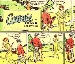 Godwin's two major strips, seen over three decades, were Connie (Ledger Syndicate, 1927[5]–1944) and Rusty Riley (King Features Syndicate, 1948–1959). Most of Godwin's comic strips over the years were for the Ledger Syndicate, including Vignettes of Life (1924–1927); Connie (1927–1944); Babe Bunting (1930–1939); The Wet Blanket (c. 1933–c. 1941); War on Crime (1936–1938); and Roy Powers, Eagle Scout (1938–1940).[6] Godwin stepped in to replace illustrator Kemp Starrett on writer Paul Powell's daily strip Roy Powers, Eagle Scout ("the official strip of the Boy Scouts of America"), continuing until 1942.[7]