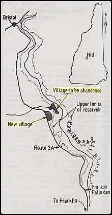 The Franklin Falls Dam is located on the Pemigewasset River in the city of Franklin, New Hampshire, in the United States. The dam was constructed between 1939 and 1943 by the Army Corps of Engineers[1] and extends for 0.75 miles (1.21 km) across the river. During its construction, the neighboring residents of the town of Hill were forced to relocate to higher ground due to rising water levels created by the dam. The reservoir formed by the dam has a permanent pool covering 440 acres (180 ha), and the total flood storage capacity is 2,800 acres (1,100 ha). The total area of the project, including surrounding managed lands, is 3,683 acres (1,490 ha).[1] The stretch of the Pemigewasset River potentially impounded by the dam extends 12.5 miles (20 km) north to Ayers Island Dam in the town of Bristol, and the watershed flowing to the dam extends north all the way into the White Mountains.