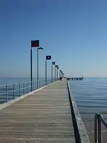 Frankston's fishing industry was further developed with the assistance of Thomas McComb, who funded the construction of Frankston Pier in 1857.[3][46][64] Following a petition by residents, to the Victorian colonial Department of Public Works, the pier was extended into deeper water in 1863.[46][64] A gaslamp was installed at the end of the pier and a lamplighter was also employed.[46] Frankston Fish Company was founded in 1867, by a consortium of local businessmen including Thomas Ritchie,[65] in order to transport the catches of local fishermen in bulk to the fish markets of the Melbourne city centre.[46]