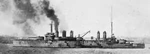 Construction of Diderot began on 26 December 1906[2] by Ateliers et Chantiers de la Loire in Saint-Nazaire and the ship was laid down on 20 October 1907. She was launched on 19 April 1909 and was completed on 1 August 1911.[4] The ship was assigned to the First Division of the First Squadron (escadre) of the Mediterranean Fleet when she was commissioned. The ship participated in combined fleet maneuvers between Provence and Tunisia in May–June 1913[5] and the subsequent naval review conducted by the President of France, Raymond Poincaré on 7 June 1913.[3] Afterwards, Diderot joined her squadron in its tour of the Eastern Mediterranean in October–December 1913 and participated in the grand fleet exercise in the Mediterranean in May 1914.[5]
