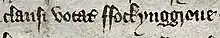 One of pre-existing boundary stones was described in the perambulation survey as 'a stone fixed in the corner of a certain close (i.e. field) called Fockynggrove' (lapidem fixum in cornerio cuiusdam clausi vocati Fockynggroue).[3] Since this was a legal document, later surveys and perambulations continue to employ the term - albeit in later published descriptions the 'F' was changed to a 'P', presumably because of the embarrassment caused by reproducing a rude word within polite publications.