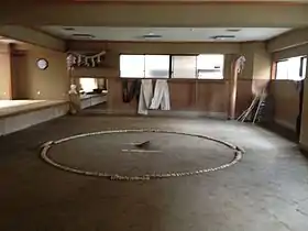 Fujishima stable (藤島部屋, Fujishima-beya), formerly known as Musashigawa stable, is a stable of sumo wrestlers, part of the Dewanoumi ichimon or group of stables. It was set up in August 1981 by former yokozuna Mienoumi, who branched off from Dewanoumi stable.[1] Since its founding Dewanoumi had a long tradition of not permitting its coaches to break away and form new stables, and Mienoumi was the first to amicably depart Dewanoumi stable since Tochigiyama set up Kasugano stable 62 years earlier.[2] By the early 2000s it had become the strongest stable in sumo, with a yokozuna, three ōzeki and several other top division wrestlers.[3] Wrestlers from the stable won six consecutive tournaments from March 1999 to January 2000.[4] In September 2008 Mienoumi also became head of the Sumo Association.[2]
