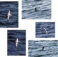 Many petrels have nocturnal habits, including the Galápagos form.[6] Indeed, they forage in the evenings and return to feed their offspring during the day.[6][10] They often fly just above the water to feed on their prey without diving in.[6][10] Courtship also occurs in the night and the petrels are often seen towering into the sky and flying erratically as a display to attract a female.[6]