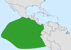 The Galápagos petrel is endemic to the Galápagos Islands.[2] They are mainly distributed in the Galápagos Marine Reserve area, but studies revealed that individuals frequently leave the reserve and disperse northeast towards South America and up to 2000 km southwards in the period between January and February.[5][11] Like other gadfly petrels, these subtropical seabirds are highly pelagic and are maladapted to the terrestrial habitats.[6] Therefore, they are usually found far from the land and will only return to their nest to breed.[6]