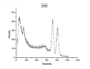 , with two gamma rays with 1.17 MeV and 1.33 MeV respectively. (See the decay scheme article for the decay scheme of cobalt-60.) The two gamma lines can be seen well-separated; the peak to the left of channel 200 most likely indicates a strong background radiation source that has not been subtracted. A backscatter peak can be seen near channel 150, similar to the second peak in Figure 1.