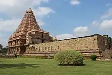 The reasons for the city's destruction are unclear. According to Vansanthi, the Pandyas who defeated the Cholas during the later part of the 13th century "may have razed the city to the ground" to avenge their previous defeats.[4] However, it is unclear why other temples were destroyed and this temple was spared, as well as why there are around 20 inscriptions from later Cholas, Pandyas and Vijayanagar Empire indicating various gifts and grants to this temple.[8] An alternate theory links the destruction to the raids and wars, particularly with the invasion of the capital city and the territories that were earlier a part by the Chola Empire along with Madurai by the armies of Delhi Sultanate led by the Muslim commander Malik Kafur in 1311, followed by Khusrau Khan in 1314 and Muhammad bin Tughlaq in 1327.[9][10][11] The period that followed saw wars between the Hindu kings and the Muslim Sultans who seceded the Delhi Sultanate and carved out new polity such as the nearby Madurai Sultanate (1335–1378).[12][note 1] The Vijayanagara Empire defeated the Madurai Sultanate in 1378 and this temple along with other Chola era temples thereafter came under Hindu kings again who repaired and restored many of them.[9][12] The temple has been re-consecrated in 2017 with installation of a dwajasthambam and performing maha kumbhabhishekam [14][15]