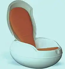 The Garden Egg chair was designed by Peter Ghyczy in 1968. It was manufactured by Reuter Products. The chair was designed for both indoor and outdoor use, although as a design icon and collectable it is rarely used outdoors. The chair lid lifts and closes, and when closed is theoretically waterproof. The Egg chair was re-introduced in 2001 by Ghyczy Novo. The Garden Egg Chair is known by several names; “seftenberger ei, pod chair, l’œuf en garden(egg)chair.” Elastogran/Reuter produced the plastic polyurethane. Ghyczy's job was to start a design centre in order to show industrial customers polyurethane's potential. The Garden Egg Chair is one of the first chairs made with polyurethane. For a long time, the chair was produced by the East German company VEB-Synthese-Werk, but since 1998, it has been produced in the Netherlands.