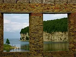 The Garden Peninsula is part of the western sill of limestone bedrock of the Niagara Escarpment. The other surviving portion of the sill is now Wisconsin's Door Peninsula. Parts of the limestone sill between the Door and Garden peninsulas have been eroded away by glaciers. An archipelago of islands south of the Garden Peninsula spans the gap between the two peninsulas, and hems in Green Bay, Lake Michigan's largest bay, to the west. The Garden Peninsula's line of limestone hills reaches as high as 165 feet (56 m) above the water at Burnt Bluff south of Fayette.[1]