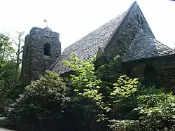 The Chapel was built in 1930-1931 by the Garrett family of whom Paul Garrett was a major figure in the American wine industry as a memorial to his son Charles who had died of tuberculosis in January 1930. The rectangular plan building is constructed of ashlar granite with cast stone decorative elements. It features a polygonal apse, round arched openings, and a large square corner tower topped by a lantern and weathervane. On the lower level is the church crypt. Also on the property is a contributing concrete block lavatory.[2]: 3–4, 6 Many of the stained glass windows in the chapel and the crypt were designed by Frederick Wilson.[3]