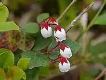 Each branch contains 1–4 nodding urceolate flowers, and there is a solitary flower on the upper leaf axil. The corolla, 6–8 mm in size, is white to faintly pinkish-white and shallowly five-lobed with slightly reflexed margins. The abaxial surface of the petals has a reddish midrib. The calyx is 3–4 mm long, vivid red and comprises 5 triangular-ovate lobes. The pedicels are 1.5–3mm long. Each flower contains 10 stamens, each around 2 mm long with awnless anthers. The pistil is 4–5 mm long and glabrous with a depressed globose ovary around 1.5 mm in diameter. The young stems, petioles, pedicels, and sepals have long hairs.[2][3]