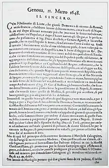 The editor, who obtained the authorization to print, was Alessandro Botticelli, who previously was a writer of hand-writing newssheets. He continued till 1646, the year in which the pro-French faction intimidated the editor of the other newspaper. The issue of 28 April 1646 was prepared by Giacomo Maria Veronese, and from that month until October 1660 the newspaper passed to Luca Assarino, a well-known writer, journalist and informer.[1] Under Assarino the newspaper supported the rights of Christine of France as ruler of the Duchy of Savoy against Thomas Francis and cardinal Maurice of Savoy supported by Spain.