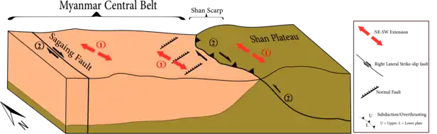The topographic boundary separating the Myanmar Central Basin (MCB) and the Shan Plateau (or Eastern Highland)[16] is referred as the Shan Scarp. The abrupt elevation over a short distance (up to 1.8 km over few km) harbors the trace of reverse faults and largely overturned folds.[16] The Shan Scarp aligns parallel to the Sagaing fault on the east.[16] The general trend of reverse fault strikes is N20°W and dips in the east-northeast direction; where some N20°E striking normal faults were identified along the fault scarp (at 21°N to 22°N latitude), north of Mandalay.[16] Dextral (right lateral) strike slip motion is also observed along the fault scarp, this motion is reasonably expected due to the nearby right lateral Sagaing fault. Southward, the Shan Scarp ends at the junction with the Three Pagodas fault.[21]