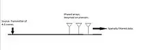This approach is applied for filtering space-time signals.[12] It is designed to isolate signals travelling in a particular direction. One of the simplest filters is weighted delay and sum beamformer. The output is the average of the linear combination of delayed signals. In other words, the beamformer output is formed by averaging weighted and delayed versions of receiver signals. The delay is chosen such that the passband of beamformer is directed to a specific direction in the space.[12]