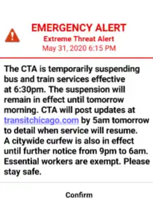 - ↑ "George Floyd fallout: New protests and unrest reported in city and suburbs; CTA suspends service; National Guard called in; city reduces access into downtown". Chicago Tribune. May 31, 2020. Retrieved June 2, 2020.