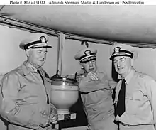 ![]() Rear Admiral George R. Henderson (right), Commander Carrier Division Five, on board USS Princeton, off the Korean coast. | |