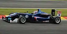 Russell graduated to Formula Three in 2015, racing in the FIA European Formula 3 Championship with Carlin.[24] He took his first race victory in the opening round of the season at Silverstone, finishing ahead of fellow debutant Charles Leclerc and Antonio Giovinazzi in the second race of the weekend.[25] He took a further two podium places at Spa-Francorchamps and the Norisring to finish sixth in the championship.[26] He also finished as runner-up to Leclerc in the rookie championship standings.[27]