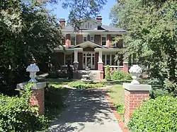 The George and Neva Barbee House, also known as the Dr. G. S. Barbee House, is a historic home located at Zebulon, Wake County, North Carolina, a town near Raleigh, NC. Constructed in 1914, the two-story, brick American Foursquare house was designed in the American Craftsman / Bungalow style. It features a hipped roof with overhanging eaves, a porte cochere, a sheltered wraparound porch, and a nearly solid brick porch balustrade.[2]