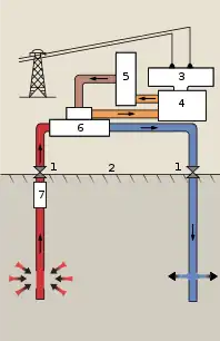 Enhanced geothermal system 1:Reservoir 2:Pump house 3:Heat exchanger 4:Turbine hall 5:Production well 6:Injection well 7:Hot water to district heating 8:Porous sediments 9:Observation well 10:Crystalline bedrock