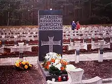 The AB-Aktion (German: Außerordentliche Befriedungsaktion, English: Extraordinary Operation of Pacification), was a second stage of the Nazi German campaign of violence during World War II aimed to eliminate the intellectuals and the upper classes of the Second Polish Republic across the territories slated for eventual annexation. Most of the killings were arranged in a form of forced disappearances from multiple cities and towns upon the German arrival.[1] In the spring and summer of 1940, more than 30,000 Polish citizens were arrested by the Nazi authorities in German-occupied central Poland, the so-called General Government.[2] About 7,000 of them including community leaders, professors, teachers and priests (labeled as suspected of criminal activities) were subsequently massacred secretly at various locations including at the Palmiry forest complex near Palmiry.[3][4] The others were sent to Nazi concentration camps.